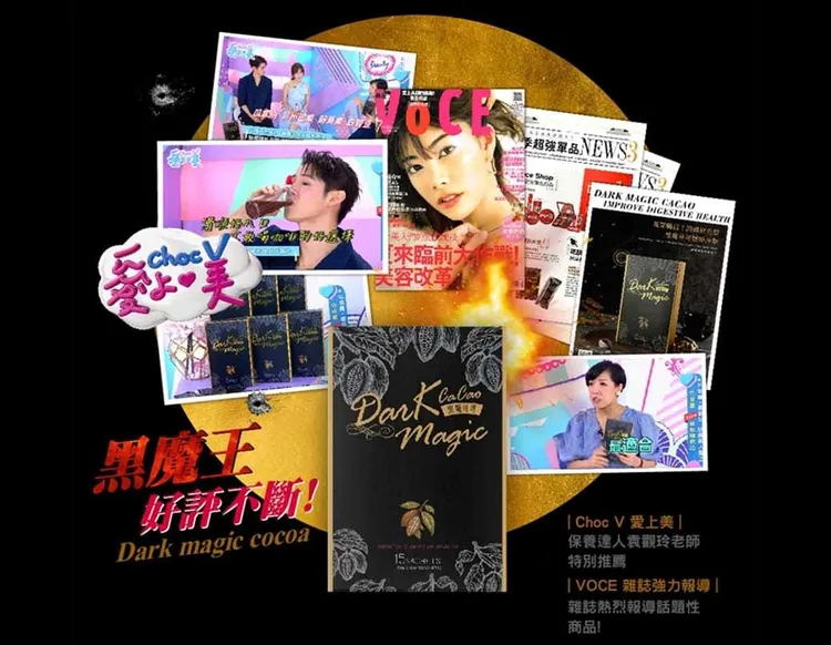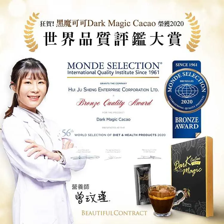 成 分:50%黑可可(可可粉、麥芽萃取物、小麥纖維、難消化性麥芽糊精、菊糖、蒟蒻粉、蔗糖素)、MCT中鏈脂肪酸 (中鏈脂肪酸甘油酯、辛烯基丁二酸鈉澱粉、脂肪酸甘油酯(植物性)、乳酸硬脂酸鈉、二氧化矽、麥芽糊精、碳酸鈣、酪蛋白鈉、維生素E(抗氧化劑)、紅花籽油CLA、Lepticore專利複合植物萃取物 ( 關華豆、刺槐豆、阿拉伯膠、石榴、Beta-胡蘿蔔素、束絲藻)、大豆卵磷脂(含磷脂醯膽鹼、糊精、二氧化矽)、瓜拿納萃取物、非洲芒果種子萃取物、藤黃果萃取物、番紅花萃取物、白腎豆萃取物。