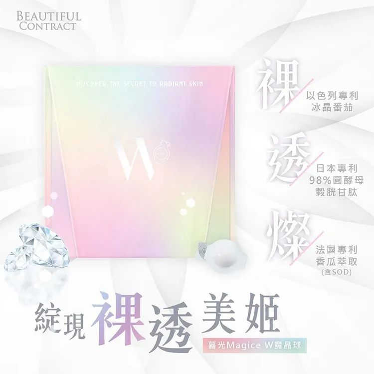 成分:鳳梨濃縮粉(鳳梨濃縮汁、麥芽糊精)、二型膠原蛋白(美國專利)、余甘子萃取(含天然鞣花酸、鞣花丹寧)、魚鱗膠原蛋白(挪威)、香瓜萃取物(含SOD)(法國專利)、血橙萃取物(義大利)、葡萄籽萃取物、穀胱甘肽(GSH98%,圓酵母來源)、冰晶番茄(白番茄萃取物)(以色列)、卡姆果萃取物(美國)、玫瑰花瓣萃取物(日本專利)、橄欖多酚(法國)、抗壞血酸(維生素C)、鳳梨萃取物(含鳳梨酵素)、綜合莓果萃取物(山桑子、草莓、蔓越莓、葡萄籽、藍莓、覆盆莓、石榴、微晶纖維素)、牛乳清蛋白萃取物(含燕窩酸)(美國)、牛乳萃取物(含賽洛美)(德國)。
