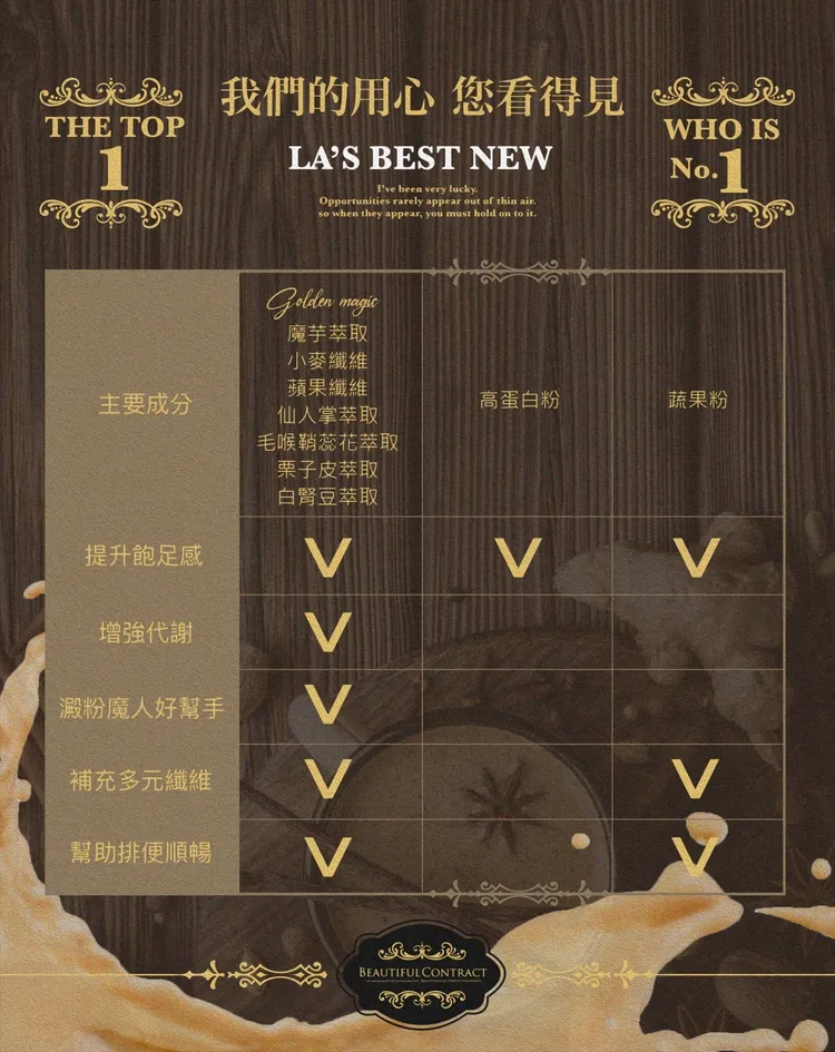 成分:特選即溶紅茶粉(伯爵紅茶)、全脂奶粉、MCT中鏈脂肪酸(中鏈脂肪酸甘油酯、辛烯基丁二酸鈉澱粉、脂肪酸甘油酯(植物性)、乳酸硬脂酸鈉、二氧化矽、麥芽糊精、碳酸鈣、酪蛋白鈉、維生素E (抗氧化劑)) 、小麥纖維、紅花籽油、瓜拿納萃取物、魔芋、蘋果纖維、甜菜根粉、蔓越莓萃取粉、洋車前子粉、Lepticore專利複合式植物萃取(關華豆、刺槐豆、阿拉伯膠、石榴、Beta-胡蘿蔔素、束絲藻)、(專利)仙人掌萃取物、番紅花萃取物、(專利)毛喉鞘蕊花萃取物、栗子皮萃取物、白腎豆萃取物、大豆卵磷脂(含磷脂醯膽鹼、糊精、二氧化矽)、藤黃果萃取物、非洲芒果種子萃取物、蔗糖素。