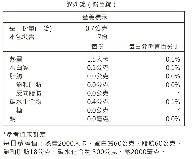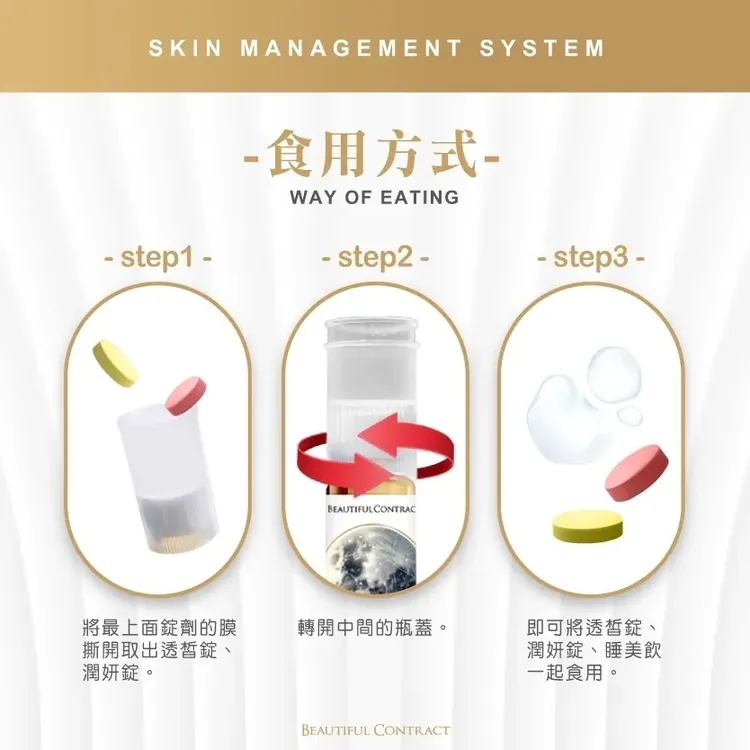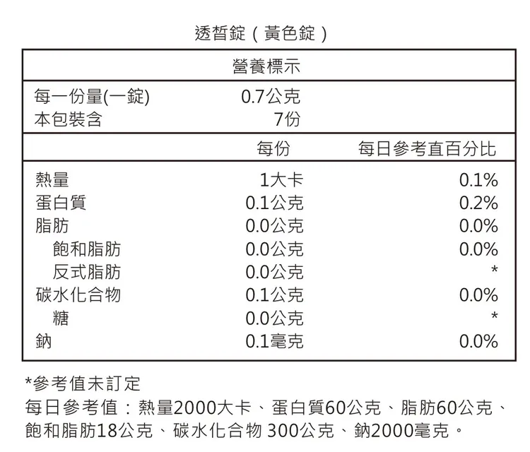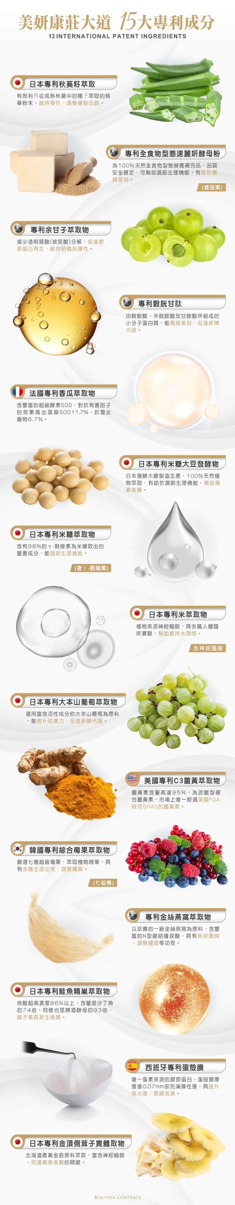 透葵黃錠(含矽素)成分:日本專利秋葵萃取物、發酵漿精、專利全食物型速麗燕酵粉(含矽素)、專利餘甘子萃取物、專利穀胱甘肽、曼橘萃取粉(含維生素C)(卡曼橘抽卡出物、麥芽糊精)、法國專利香瓜萃取物、硬脂酸鎂、白色膜衣粉(順便說丙)甲基纖維素、二氧化鈦、日本專利大山本葡萄葡萄牙萃取物(糊精、大本山葡萄萃取物、玉米澱粉)、西班牙專利蛋殼膜、L-色番茄萃取物、美國專利C3薑黃萃取物、流行鏈球菌發酵物(含玻尿酸鈉)、番茄萃取物(麥芽糊精、萃取番茄物)、芝麻萃取物、日本專利米萃取物(含神經醯胺)(奶粉糊精、米萃取物)、硬脂酸鎂、白色膜衣粉(補充纖維素、二氧化鈦、聚糊精、滑石粉、聚水槽)、食用紅色六號。專利綜合莓果萃取物(七仙莓)(麥芽糊精、黑莓果粉、黑醋栗果粉、藍莓果粉、草莓果粉、複蓋盆子莓果粉、蔓越莓果粉、巴西莓果粉)、卡姆果萃取物(含維生素C)、流行鏈球菌發酵(含透明質酸鈉)、番茄萃取物(冰晶番茄)、日本專利金絲燕窩萃取物、日本專利金頂側萃取物、日本專利鮭魚精巢萃取物、鰹魚彈性蛋白。