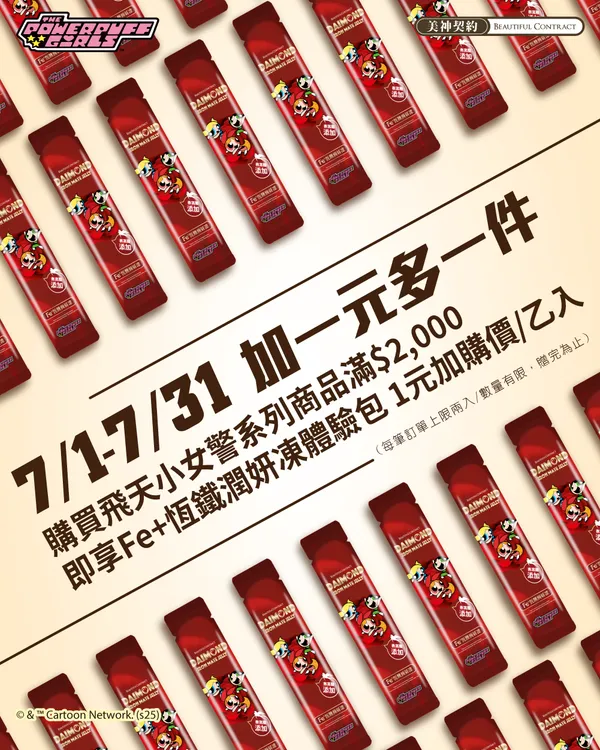 購買飛天小女警系列商品滿$2,000,即享Fe+恆鐵潤妍凍體驗包 1元加購價/乙入