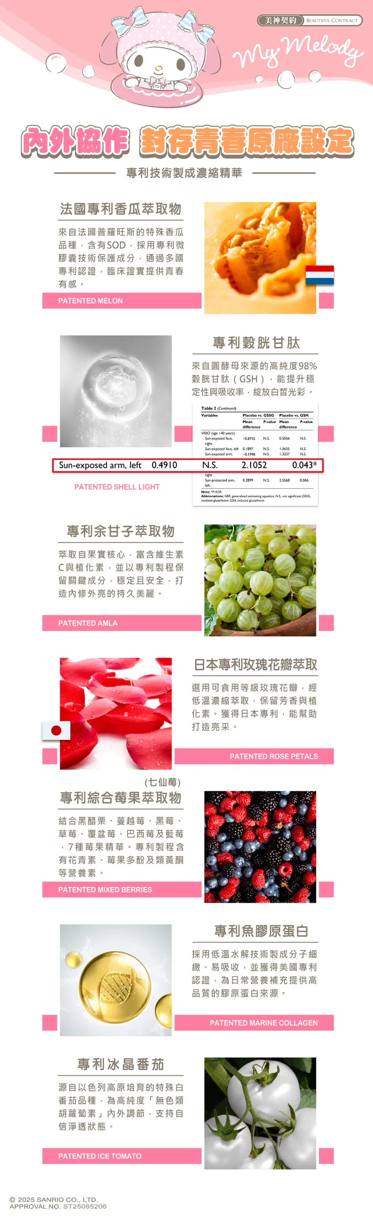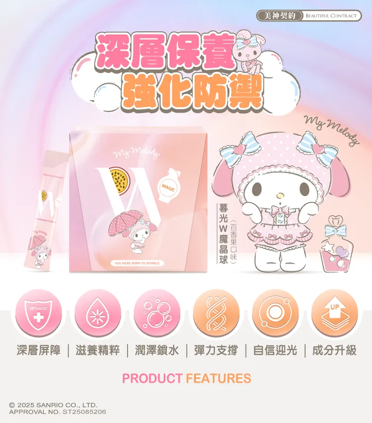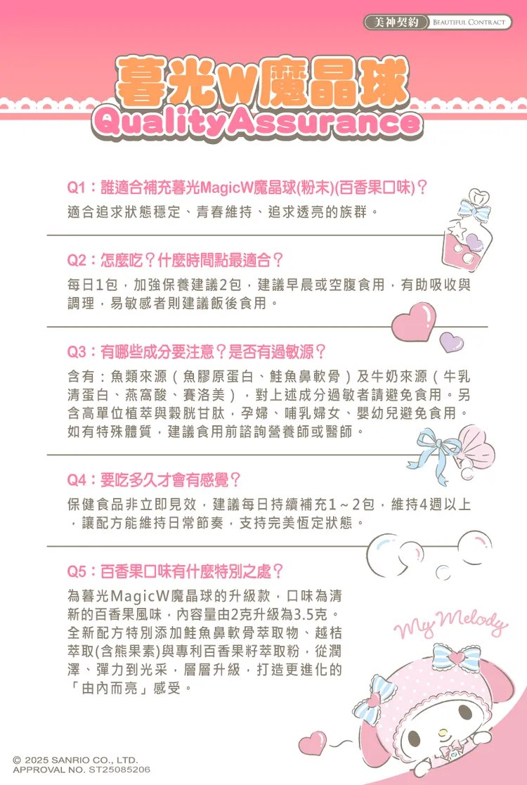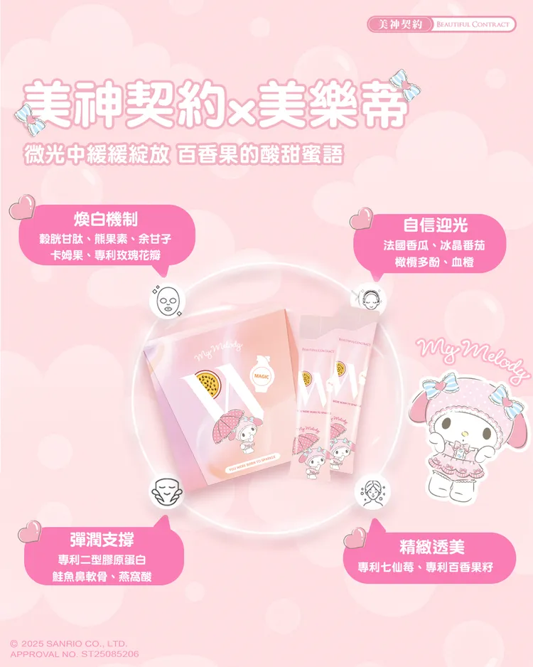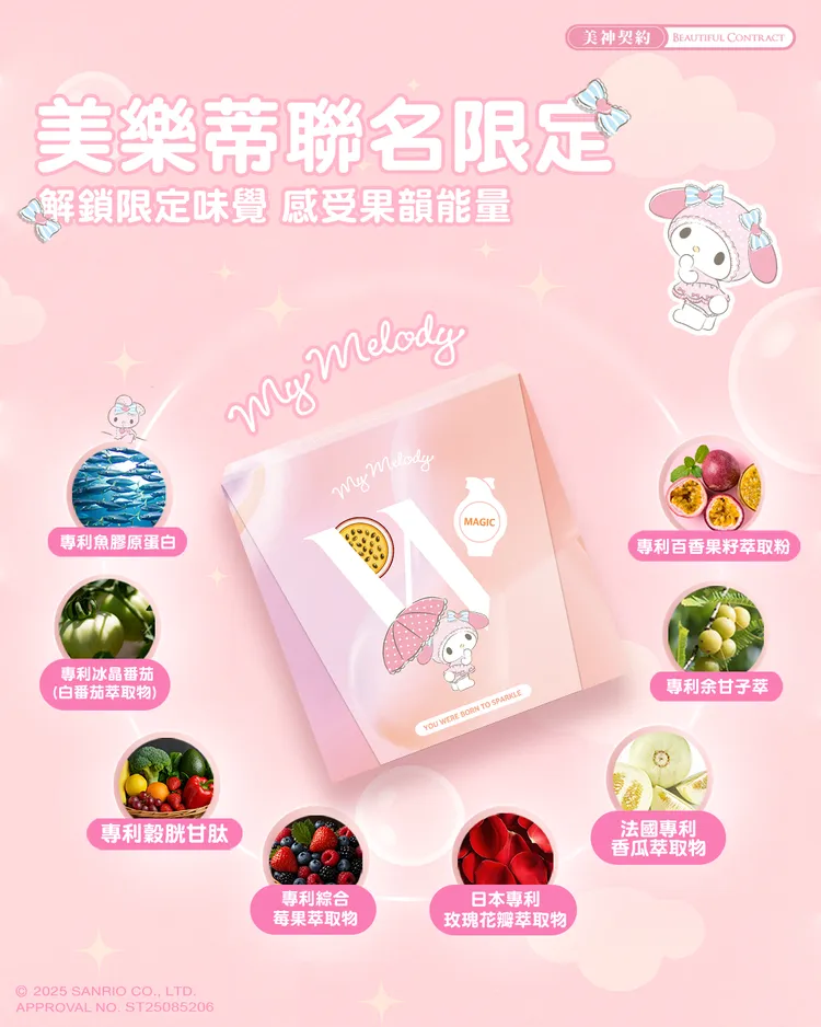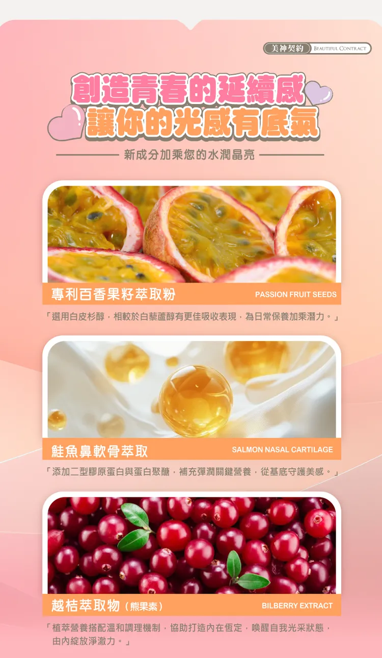 成分:百香果粉(百香果汁、麥芽糊精) 、專利余甘子萃取、赤藻醣醇(甜味劑) 、專利魚膠原蛋白、法國專利香瓜萃取物、血橙萃取物粉(血橙萃取粉、麥芽糊精)、葡萄籽萃取物、專利冰晶番茄(白番茄萃取物) 、專利穀胱甘肽(GSH98%,圓酵母來源)、抗壞血酸(維生素C) 、卡姆果萃取物、日本專利玫瑰花瓣萃取物、橄欖葉萃取物(橄欖葉萃取物、麥芽糊精)、鳳梨萃取物(含鳳梨酵素)、專利綜合莓果萃取物(麥芽糊精、黑莓果粉、黑醋栗果粉、藍莓果粉、草莓果粉、覆盆莓果粉、蔓越莓果粉、巴西莓果粉)、鮭魚鼻軟骨萃取、牛乳清蛋白萃取物(含燕窩酸)、越桔萃取物(熊果素) 、專利百香果籽萃取粉(麥芽糊精、百香果籽萃取物) 、牛乳清蛋白萃取物(含賽洛美) 、甜菊萃取物(甜味劑)。