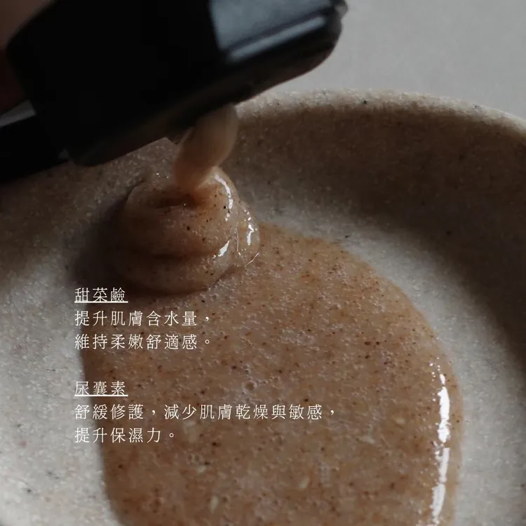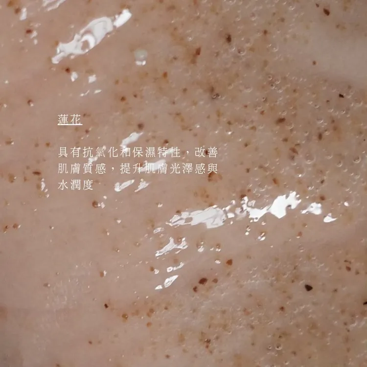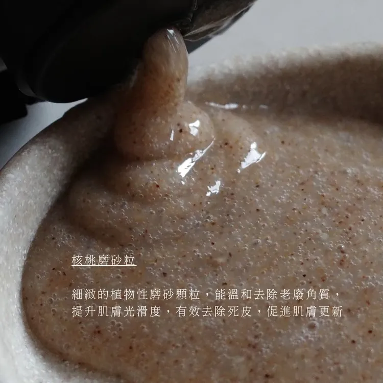 細緻植物性顆粒,溫和帶走多餘角質,使肌膚觸感更滑順。